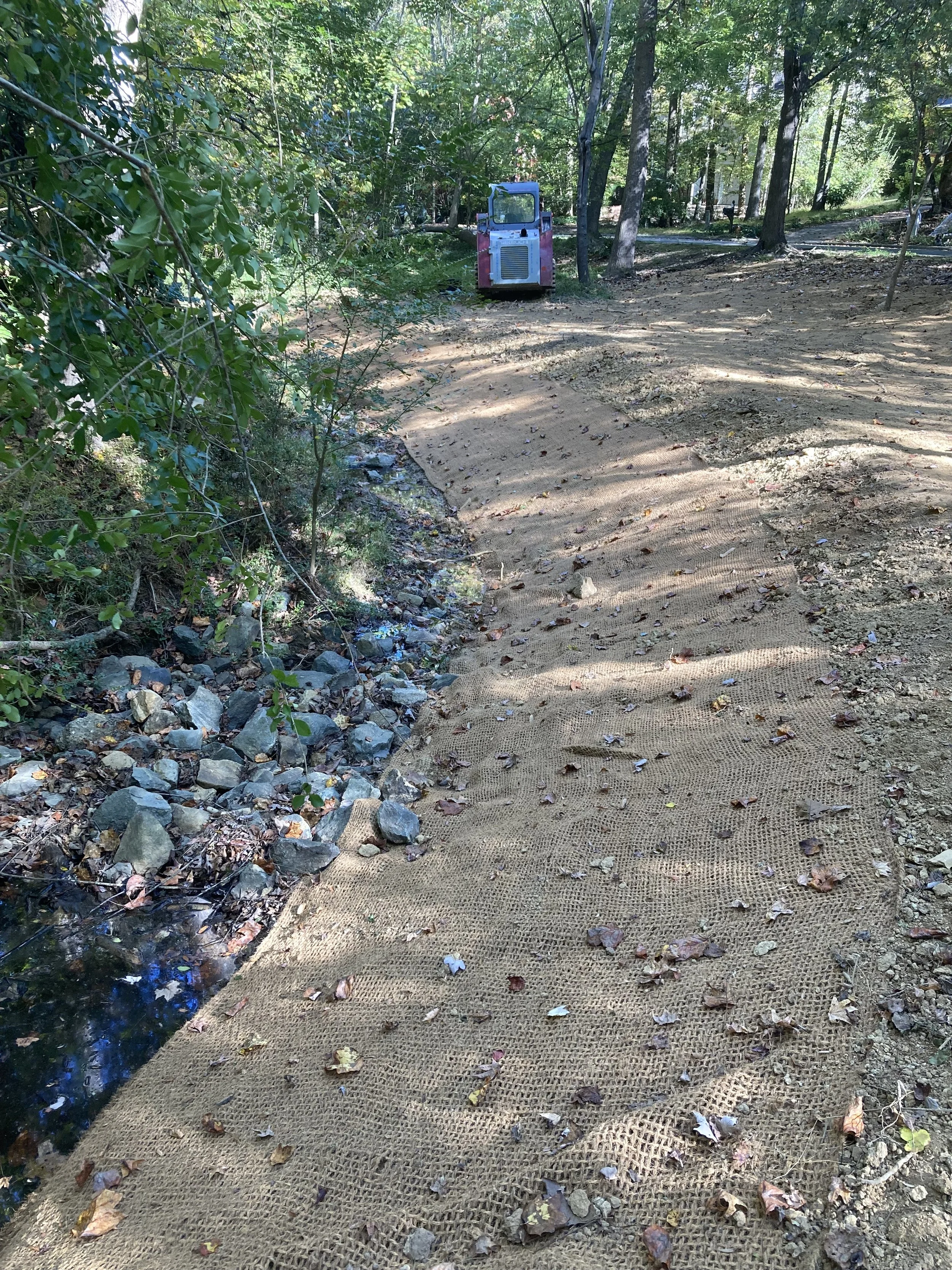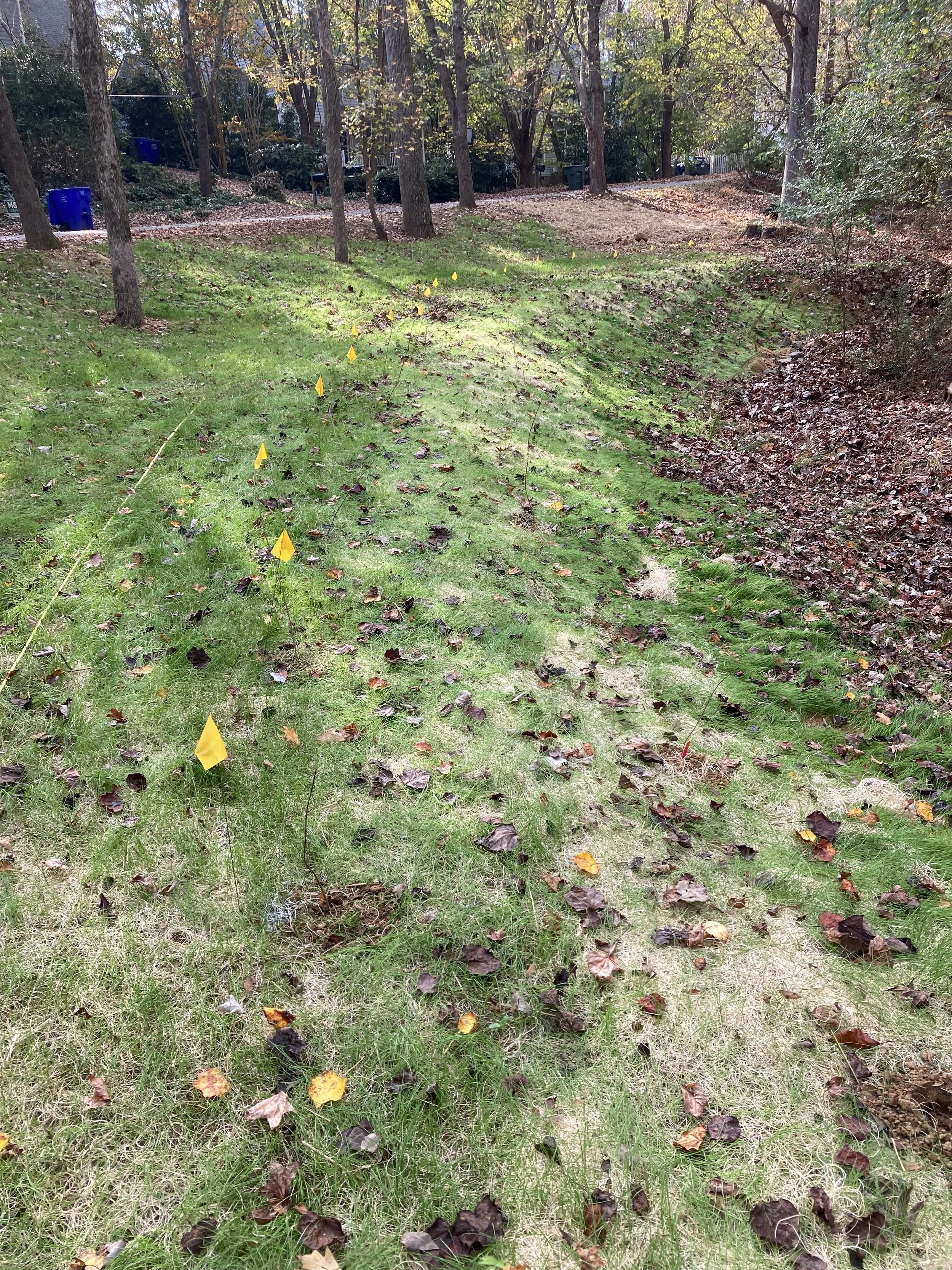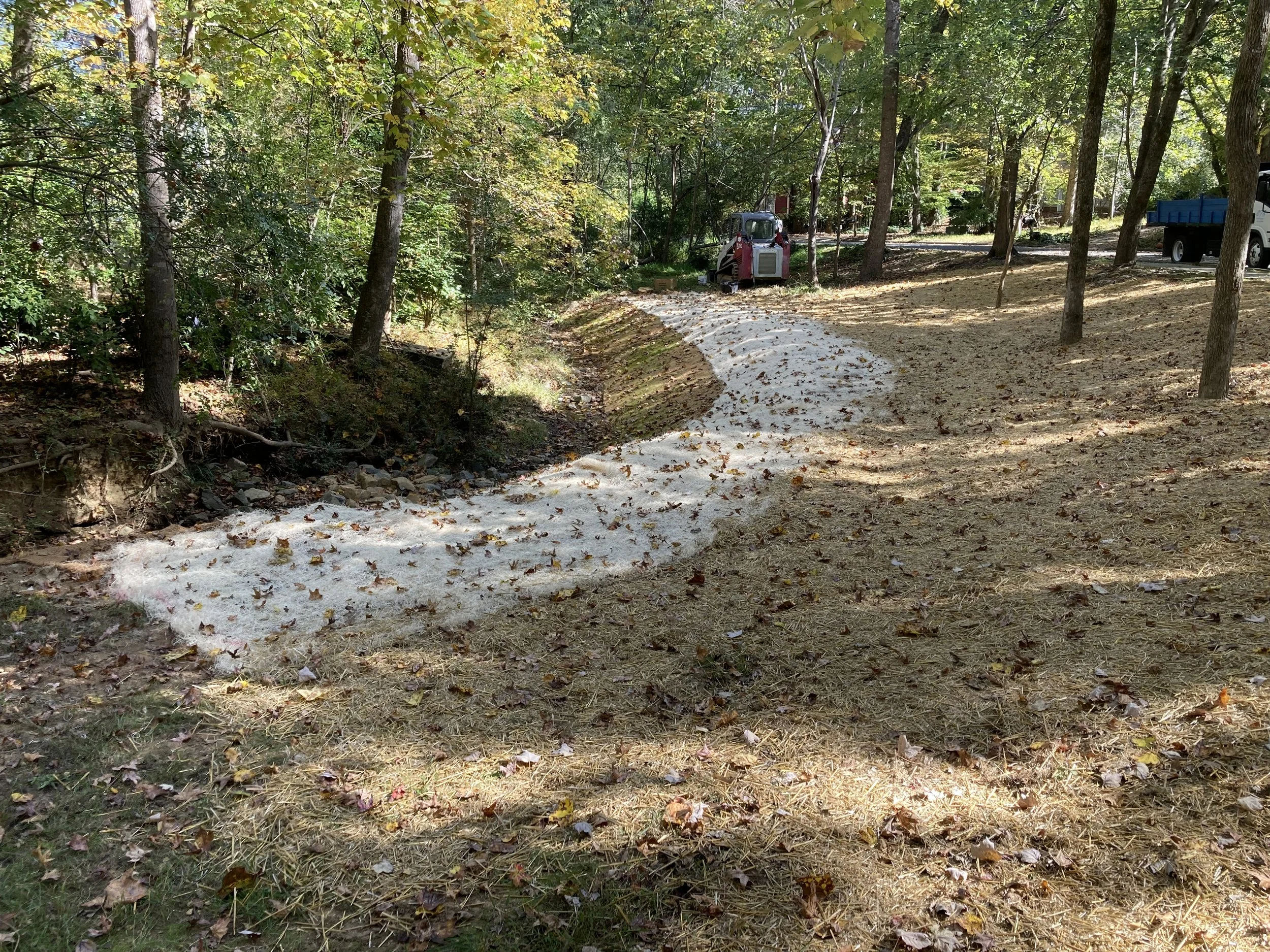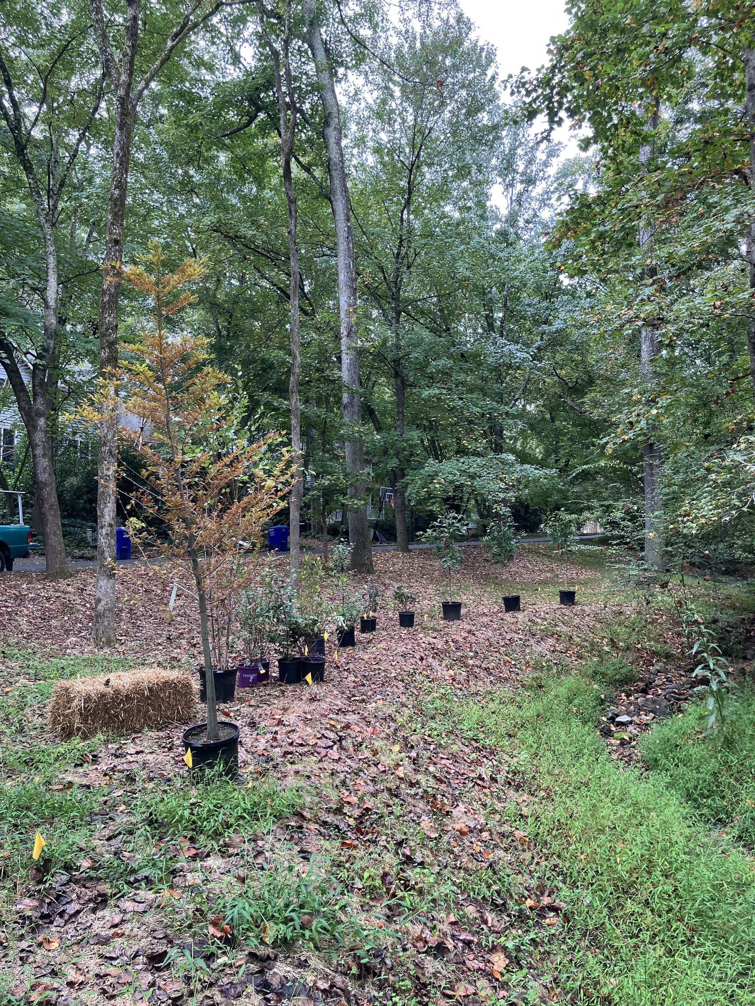 A swale was installed at the drop inlets. Streambank stabilization practices were installed on 95 feet of one side of the stream. The stream buffer area was being mowed and the HOA agreed to stop all maintenance practices to allow this area to naturalize. The area was seeded with native riparian buffer mix and 100 tublings of native Sambucus canadensis (Elderberry) and Lindera benzoin (Northern Spicebush) were planted.