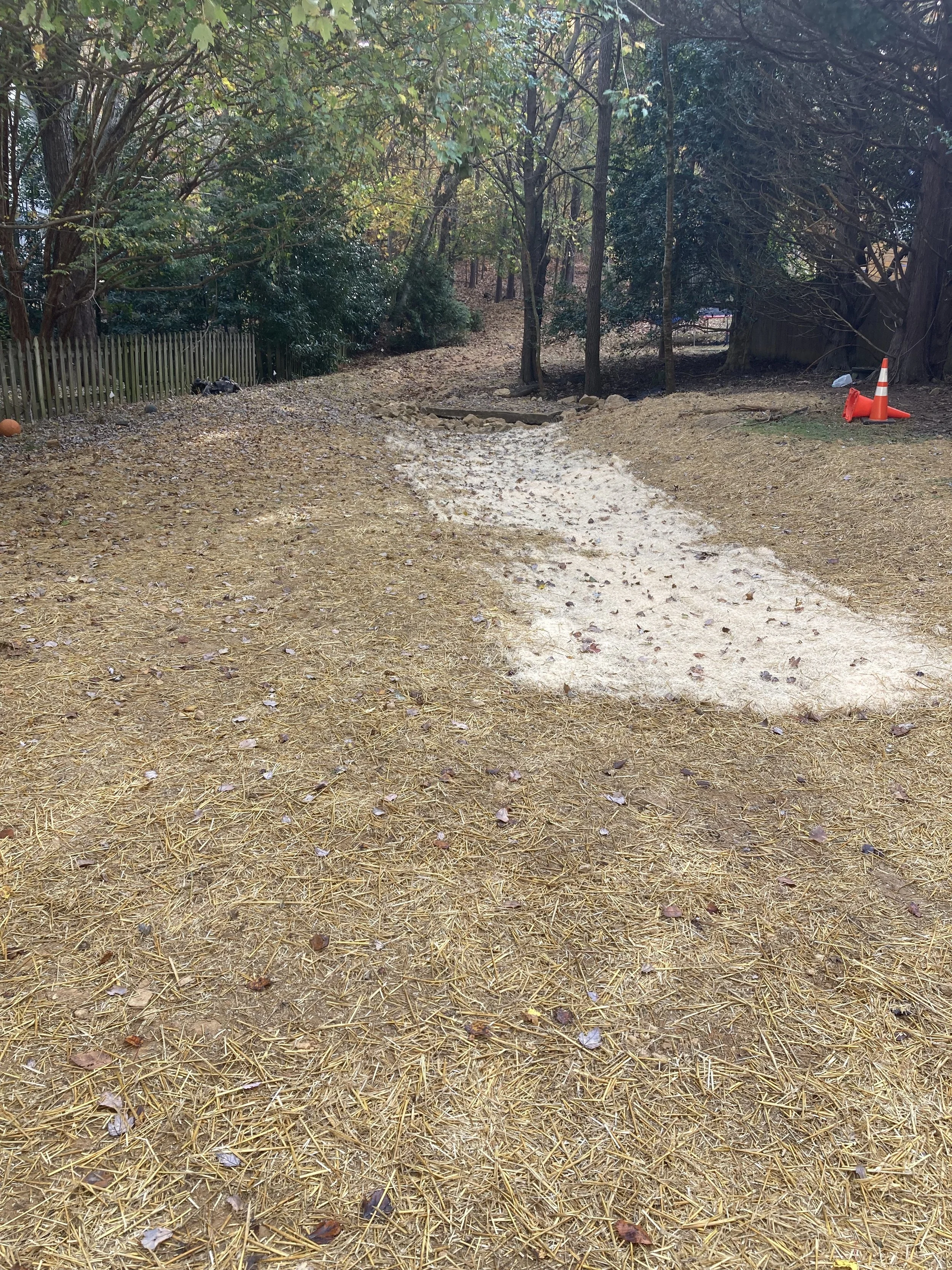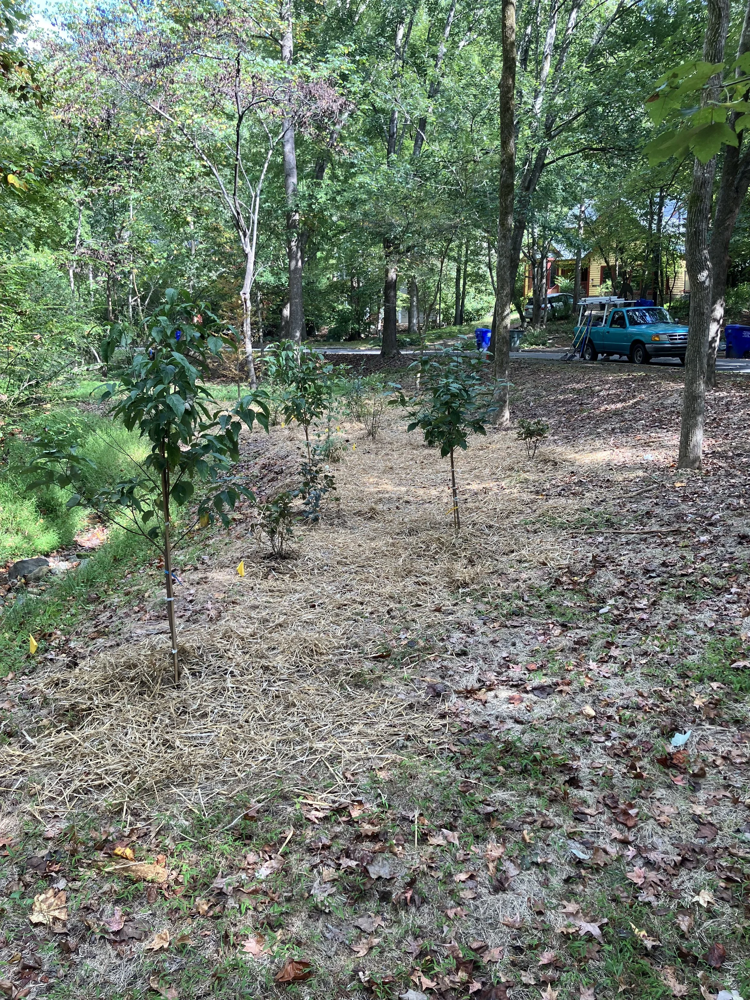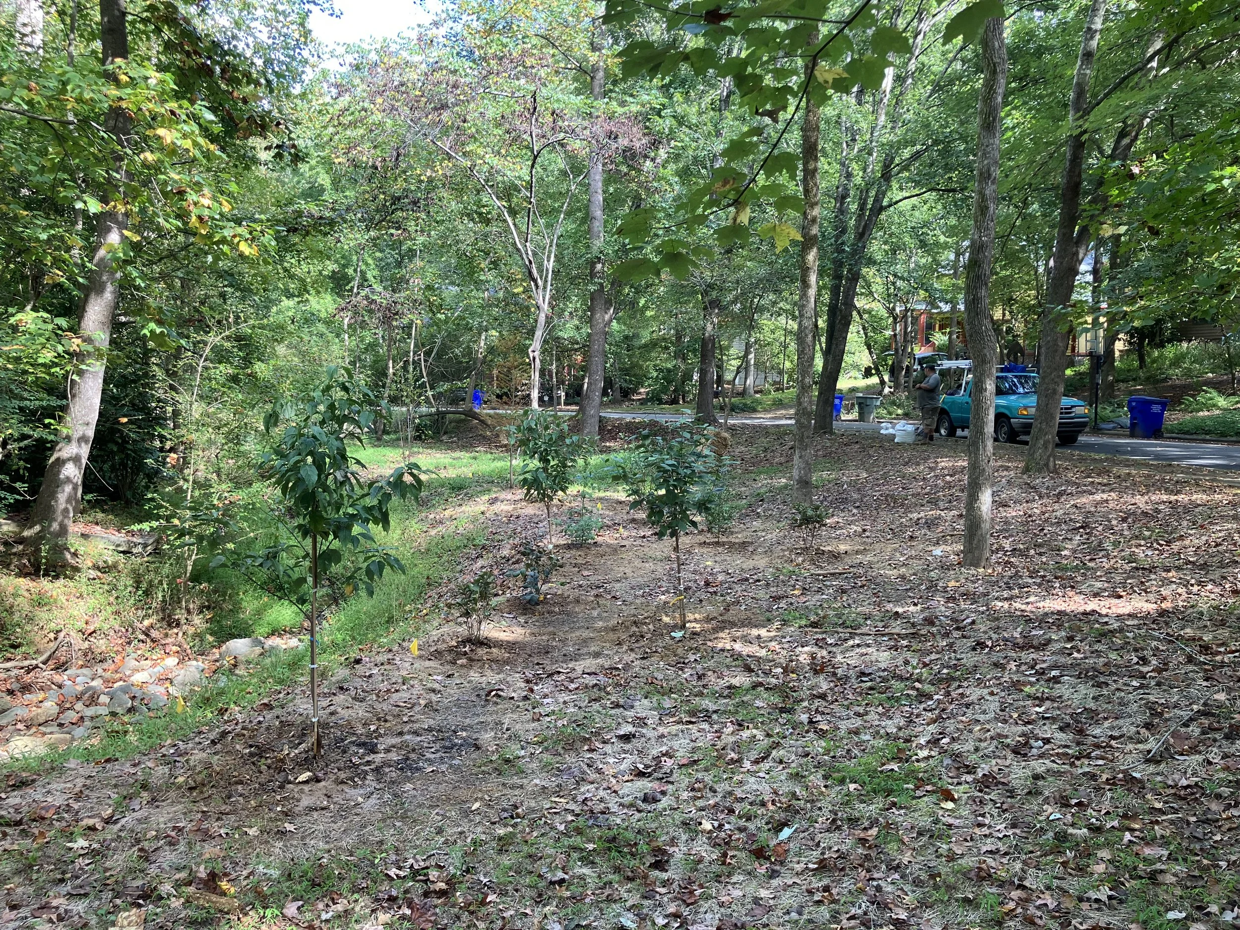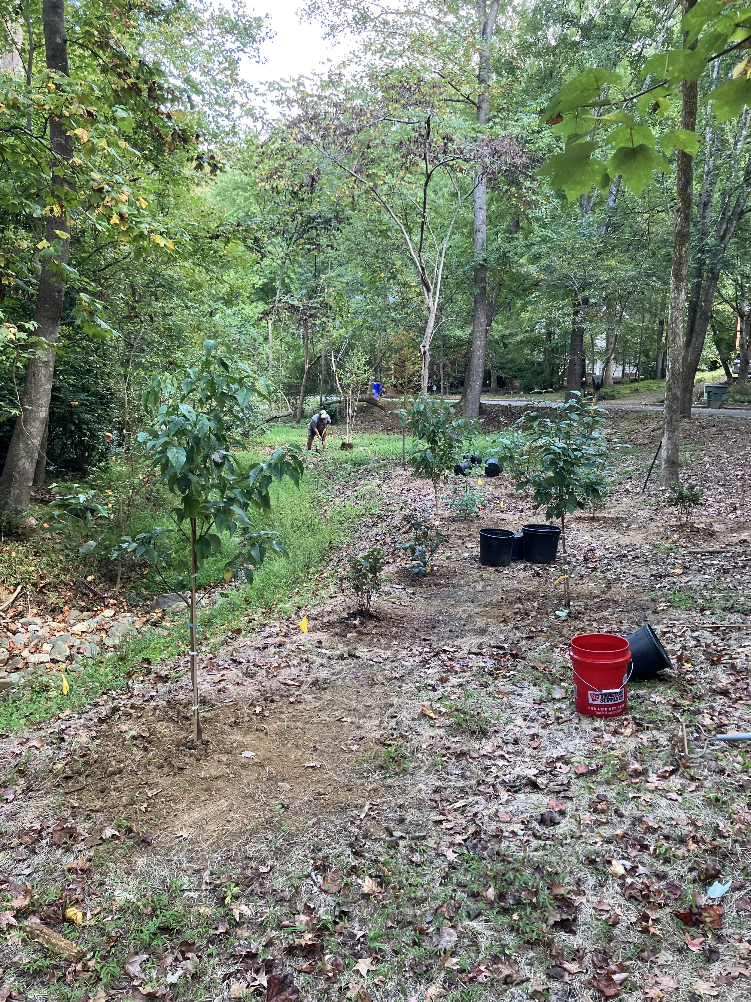 A swale was installed at the drop inlets. Streambank stabilization practices were installed on 95 feet of one side of the stream. The stream buffer area was being mowed and the HOA agreed to stop all maintenance practices to allow this area to naturalize. The area was seeded with native riparian buffer mix and 100 tublings of native Sambucus canadensis (Elderberry) and Lindera benzoin (Northern Spicebush) were planted.